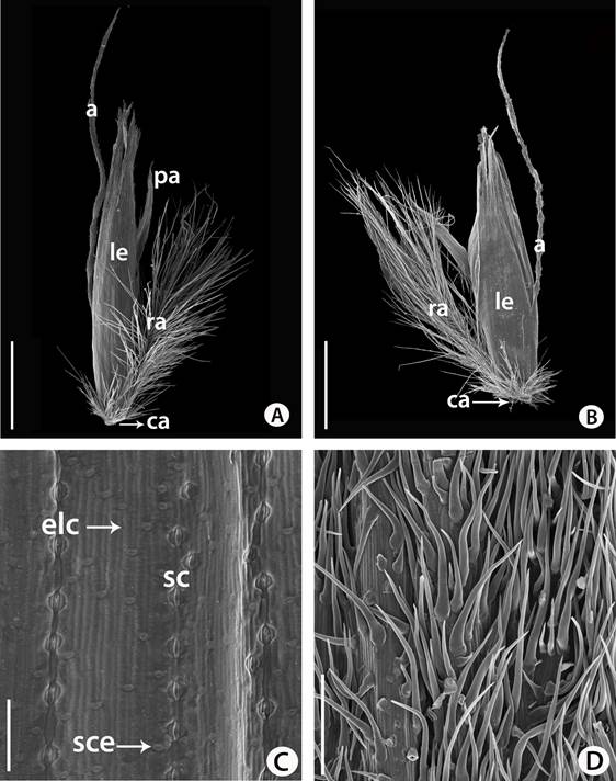Florets, as well as small fragments of leaf sheaths (middle zone), were placed in glass tubes with xylene and exposed to ultrasound for approximately one hour to eliminate superficial wax and impurities. The material was air-dried, mounted, and coated with a gold-palladium (40%-60%) alloy by a Thermo VGScientific (West Sussex, UK). Photomicrographs were obtained using a Phillips XL 30 (Einhoven, The Netherlands) Scanning Electron Microscope (SEM) at the Museo Bernardino Rivadavia (Buenos Aires, Argentina).