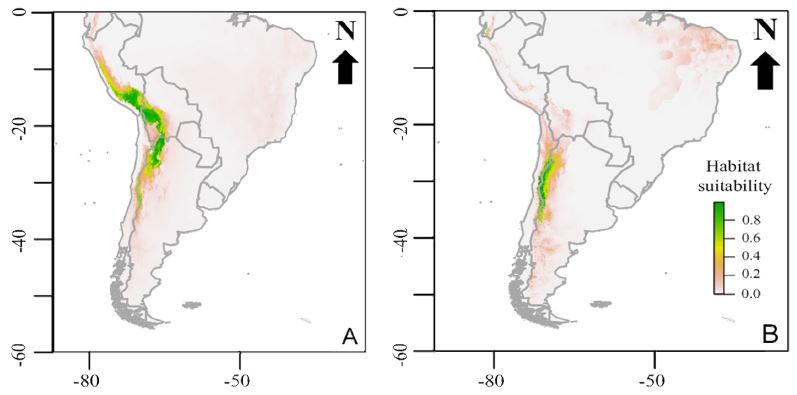 Deyeuxia velutina inhabits high-elevation habitats along the Andes, with an altitudinal interval between 1300 to 5400 m a.s.l. The species have been reported to occur from Peru to the center of Argentina, reaching Neuquén, and our potential distribution models predict suitable environmental conditions between 8°-35° S and 68°-77° W (Fig. 3).