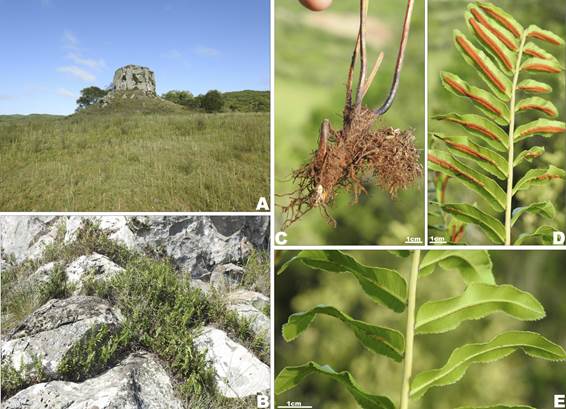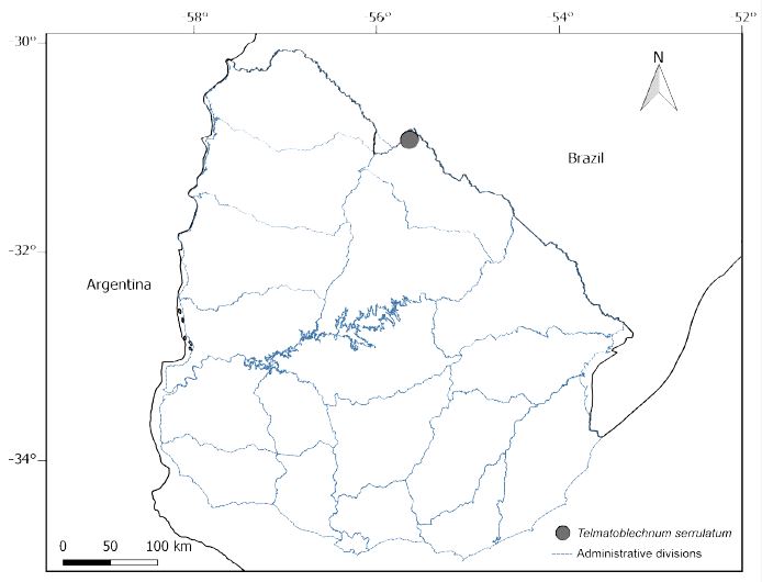 One of the lineages recognized to genus level is Telmatoblechnum Perrie, D.J. Ohlsen & Brownsey, included in the subfamily Stenochlaenoideae (Ching) J.P. Roux, and characterized by long-creeping rhizomes, covered with bicolorous, lanceolate, entire scales; fronds monomorphic to slightly dimorphic (in T. indicum (Burm. f.) Perrie, D.J. Ohlsen & Brownsey, with pinnae of fertile fronds slightly smaller), with pinnae articulate to rachises and margins serrate, veins free, 1-3-forked, ending at the pinna margins; sori linear, close to costae, with narrow indusia, margins erose or lacerate. The genus includes just two species which often grow in humid places as swamps, with their rhizomes and lower parts of fronds under water, or humid savannas. The species Telmatoblechnum indicum grows in Thailand, Malaysia, Indonesia, Papua New Guinea, Australia, Vanuatu, and New Caledonia (Perrie et al., 2014), whereas Telmatoblechnum serrulatum (Rich.) Perrie, D.J. Ohlsen & Brownsey has an American distribution, with its southernmost limit in southern Brazil and northeastern Argentina. Recent botanical explorations in Uruguay allowed the discovery of a population of T. serrulatum growing in crevices between rocks of basalt and sandstone in a small hill. This finding constitutes the first record of the genus for the Uruguayan flora and a novel habitat for the species. In this work we present a description of the species and its habitat in Uruguay, as well as photographs and a map with the location of the new record. Also, a key to the genera of Blechnaceae in Uruguay is provided.