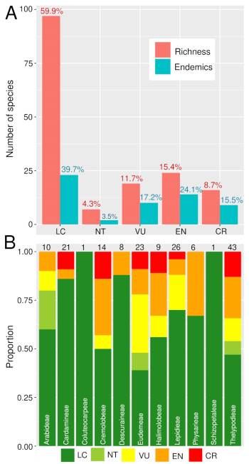 The current global extinction crisis presents a great ecological challenge, and the loss of biodiversity is one of the most critical ongoing environmental problems (Dirzo & Raven, 2003; Ceballos et al., 2015). Global warming, coupled with habitat destruction and degradation, are causing substantial species-range shifts, contractions and local extirpations, which can be major causes of biodiversity loss (Brook et al., 2008; Chen et al., 2011; Urban, 2015). However, the need for conservation actions sometimes contrasts with the considerable uncertainty about the status of threats (Corlett, 2016; Bachman et al., 2018) and the spatial distribution of diversity (Whittaker et al., 2005; Bini et al., 2006). Species extinction risk assessment following the IUCN Red List categories and criteria (International Union for Conservation of Nature, www.iucn. org) is widely recognized as one of the most useful approaches for identifying conservation priorities and targeting government decisions to mitigate impacts on biodiversity (Ricketts et al., 2005; Rodriguez et al., 2006; Brooks et al., 2015; Bennun et al., 2018; Nic Lughadha et al., 2020). Although IUCN Red List Category data are produced on a global scale, is also essential to establish IUCN threat categories at the regional level in order to implement concrete conservation actions (Gärdenfors et al., 2001).