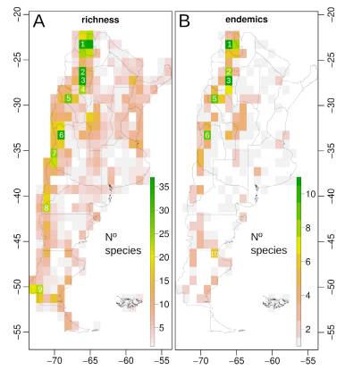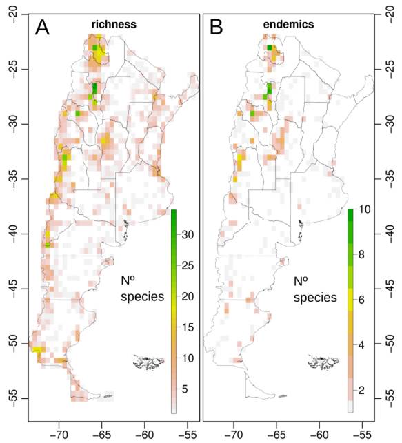 Species richness was higher in cells located in: (c1) Jujuy province, Cochinoca and Humahuaca departments (~ 23.1ºS, 65.8ºW) along the Central Andean Puna ecoregion, and mainly associated with the highlands of “Sierra del Aguilar” and other secondary localities, such as “Tres Cruces, “Esquinas Blancas”, and “Humahuaca” (Figs. 5A, S6 from Supplementary Material); (c2) Tucumán province, Tafi del Valle department (~ 26.5ºS, 65.8ºW), primarily along the Central Andean Puna ecoregion and associated to the highlands of the “Cumbres Calchaquíes” mountain system (e.g., “Cerro Negrito”); (c3) Tucumán (depts. Tafi del Valle and Chicligasta) and Catamarca (dept. Andalgalá) provinces (~ 27.0ºS, 65.8ºW), along the Central Andean Puna, Southern Andean Yungas, and High Monte ecoregions, and related to elevations of the “Sierra del Aconquija” mountain system (e.g. “Cerro el Bolsón”, “Cerro Yutuyaco”); (c4) Catamarca province, Ambato department (~ 28.2Sº, 66.0Wº), in the High Monte and Dry Chaco ecoregions, and mainly associated with the highlands of the “Sierra del Manchao”; (c5) La Rioja province, Famatina department (~29.0ºS, 67.8ºW), within the High Monte ecoregion and associated with the mountain slopes of the “Sierra de Famatina”; (c6) north of the Mendoza province, Las Heras, Luján de Cuyo, Tupungato, and Tunuyán departments (~33.6S, 69.5W), along the Southern Andean steppe ecoregion, and mainly associated with the Andean highlands in “Cordón del Plata” (e.g., “Cerro del Plata”) and “Portillo de Piuquenes”; (c7) south of Mendoza province, Malargüe department (~35.1Sº, 70.2Wº), along the Southern Andean steppe ecoregion, and related to the Andean slopes along “Valle Hermoso” and the highlands of “Cerro Campanario” and “Paso Pehuenches”; (c8) Río Negro (dept. Bariloche) and Neuquén (dept. Los Lagos) provinces (~41.0Sº, 71.4Wº), along Valdivian Temperate forest and Patagonian steppe ecoregions, associated with the mountain slopes in the “Nahuel Huapi” national park (e.g., “Cerro Catedral”, “Cerro Negro”, “Cerro López”, “Cerro Ventana”, and “Cerro Ñireco”); (c9) South of Santa Cruz province, Lago Argentino and Güer Aike departments (~50.5Sº, 72.5Wº), along the Magellanic Subpolar forest and Patagonian steppe ecoregions, associated with elevations in the “Los Glaciares” National Park (e.g., “Cerro Buenos Aires” and “Cordon de los Cristales”), “El Calafate” (e.g., “Cerro Calafate” and “Cerro Huyliches”), and the “Vizcachas” river basin (e.g., “Cerro de la Virgen”, “Cerro Tridente”, “Cerro Pináculo”, and “Cerro Pan de Azúcar”) (Fig. 5A). Endemic species were more represented in cells from “Sierra del Aguilar” and “Humahuaca” (c1), “Cumbres Calchaquíes” (c2), “Sierra del Aconquija” (c3), “Sierra de Famatina” (c5), “Cordón del Plata” (c6), and a new cell located in the east of the Chubut (dept. Escalante) - Santa Cruz (dept. Deseado) provinces (45.9Sº, 68.4ºW) (c10), along the Patagonian steppe and primarily associated with the “Pampa del Castillo” locality (Fig. 5B).