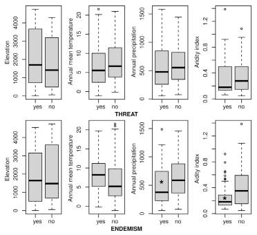 We also analyzed differences in elevation, annual mean temperature (BIO1), annual precipitation (BIO12), and aridity (AI) for endemic vs. non-endemic and threatened vs. non-threatened species. These variables can represent limiting climatic factors that constrain species distributions in the face of global warming and desertification (Jezkova & Wiens, 2016). After removing occurrences closer to 30 arc-seconds (~1 km), we extracted values of BIO1 and BIO12 for each occurrence point from the CHELSA v1.2 climatic dataset (Karger et al., 2017a; 2017b; climate.org/) at a resolution of 30 arc-seconds (~1 km2), while values of the annual aridity (AI) were obtained from the CGIARCS v2 database (Trabucco & Zomer, 2019) at the same resolution. Elevation data was extracted from specimen vouchers and by georeferencing. Values obtained for each variable were then used to calculate the mean of each species, and the Mann-Whitney U test was conducted to assess for differences between (1) endemic vs. non-endemic species and (2) threatened vs. non-threatened species, for elevation, BIO1, BIO12, and IA. Despite the fact these variables may exhibit phylogenetic signal, this is an explicitly non- phylogenetic test, since rather than an evolutionary signal, we are interested in whether the association exists at time zero given current conditions.