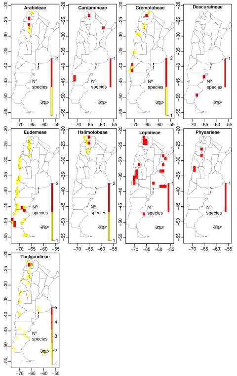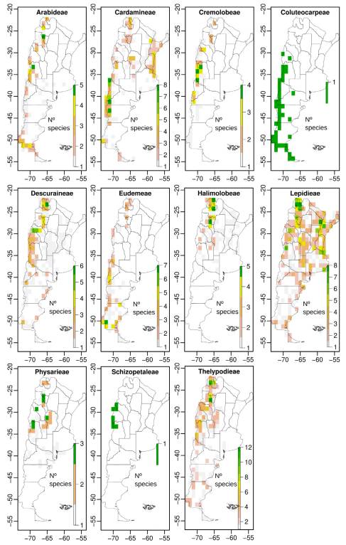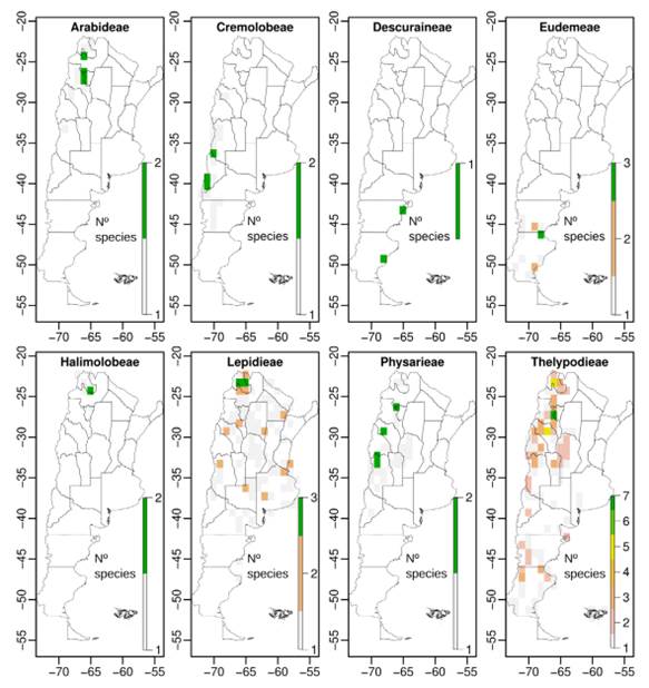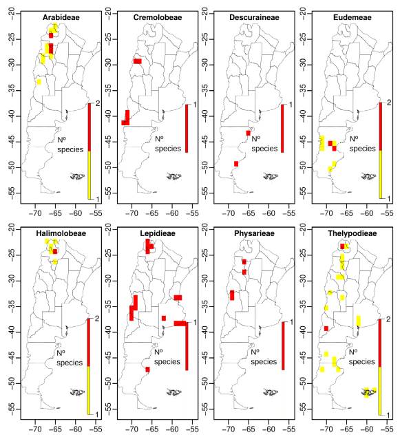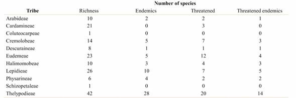 When we analyze the number of endemics and threatened species by tribe, Thelypodieae presented the highest values, followed by Lepidieae and Eudemeae (Table S4, Supplementary Material).