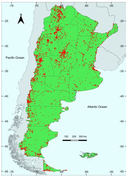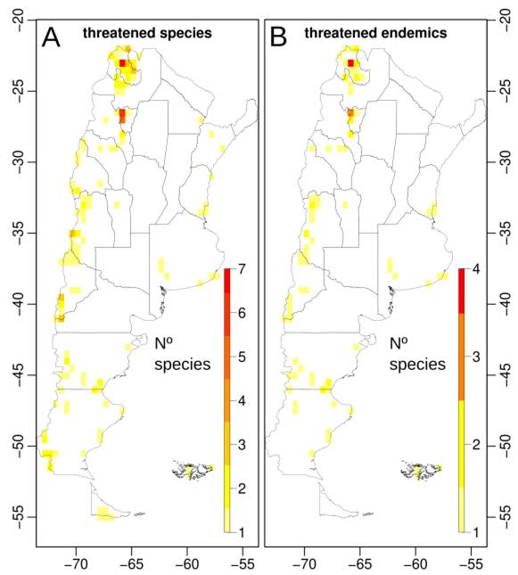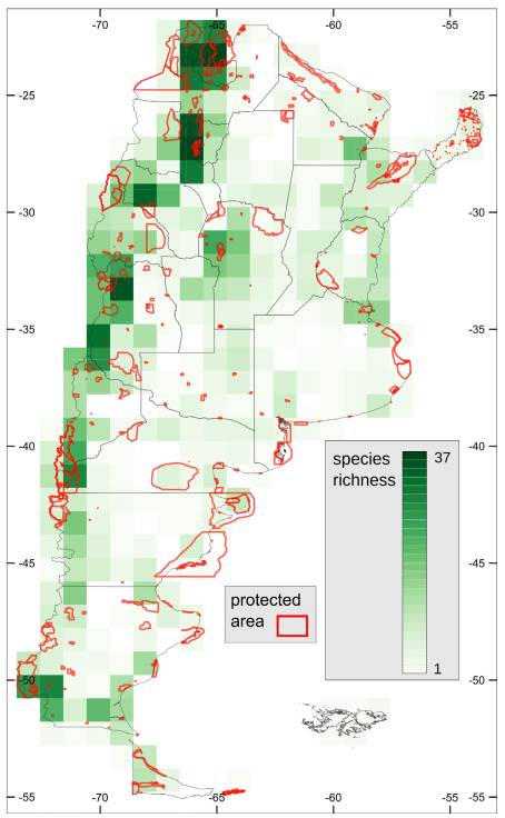 Alternatively, we explored spatial patterns for the four variables (richness, threat, endemics, and threatened endemics). Because the use of small cells would result in a finer and more detailed resolution, but at the same time increase the number of artificially empty cells where species occur but have not been recorded (Linder, 2001), we used grids at two different cell sizes, 1 and 0.5 arc-degrees (approx. 100 × 100 km and 50 × 50 km, respectively), to explore both distribution patterns at different scales and the robustness of the results to changes in the grid size. Analyses were conducted using the R packages raster v3.1.5 (Hijmans, 2020) and sp v1.4.2 (Pebesma & Bivand, 2005; Bivand et al., 2013). The protection status of the hottest cells was evaluated overlaying shapefiles of the protected areas in Argentina provided by the Biodiversity Information System of the National Parks Administration (SIB-APN) (https://sib.gob.ar/cartografia).