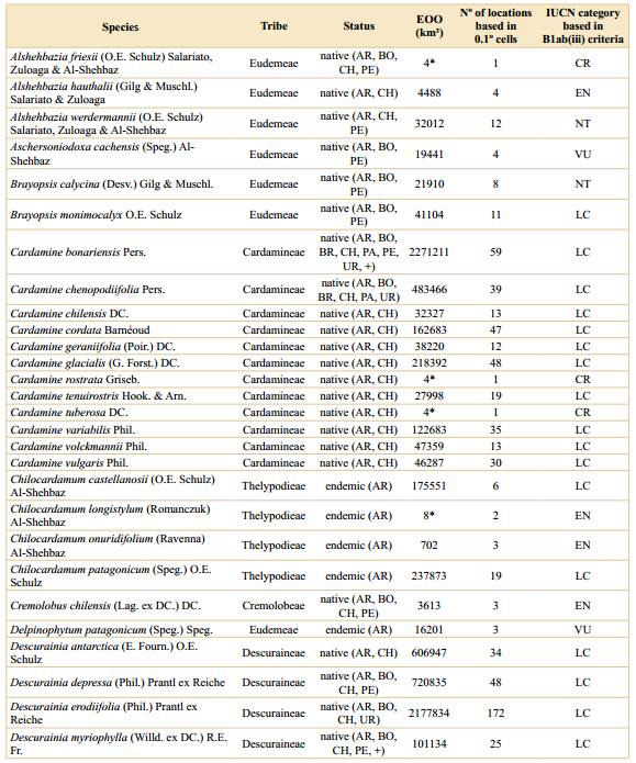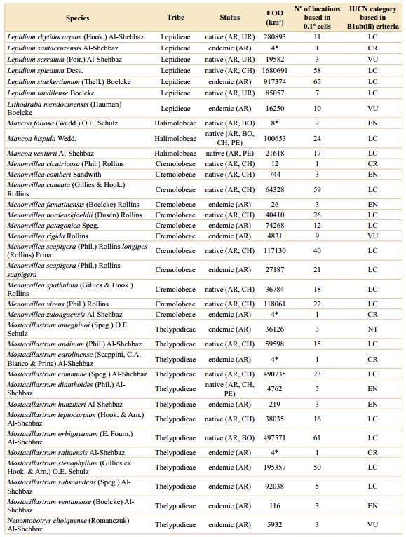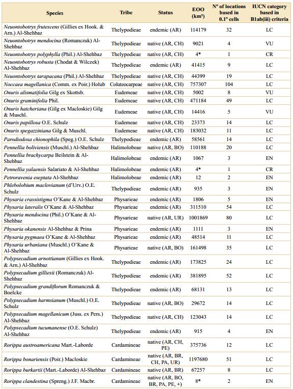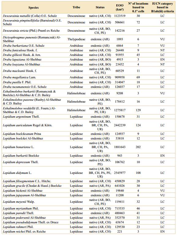 Based on these observations for the Brassicaceae family, and since urgent conservation strategies need to be implemented in order to preserve the native flora of Argentina (Morea, 2014), here we explored the geographic distribution of Argentinean crucifers using georeferenced species distributional data, to preliminary classify the species according to the IUCN threat categories, and analyzing patterns of richness, endemism, and threat in the different ecoregions and biomes of the country. Furthermore, elevation, annual mean temperature, annual precipitation, and aridity were compared for endemic vs. non-endemic and threatened vs. non- threatened species. Geographical range maps for all Argentinean native crucifers are also provided. This work seeks to contribute to the knowledge of the geographical distribution of the Argentinean flora and its conservation, complementing the Brassicaceae treatment of the Argentinean Flora (Al-Shehbaz, 2012a).