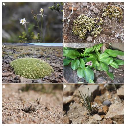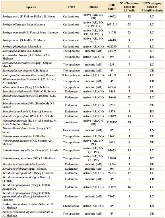 Argentinean crucifers seem to be mainly distributed along the central and southern Andean highlands (~ 22º to 55ºS latitude), inhabiting a variety of habitats in the Altoandina, Puna, and Prepuna biogeographical provinces (sensu Cabrera & Willink, 1980). These highland ecosystems are considered highly sensitive to climatic change and global warming (Halloy & Mark, 2003; Gonzales, 2009; IPCC, 2014; Cuesta et al., 2017). Furthermore, the restricted altitudinal range that many species occupy within these highland ecosystems, enhances their vulnerability to climatic change (Urban, 2015). On the other hand, endemics of this family are also present in lowlands of Patagonia and Central-Eastern Argentina [e.g., Chilocardamum patagonicum, Lepidium parodii, Lepidium hickenii, Mostacillastrum subscandens, Mostacillastrum ventanense, Physaria lateralis, and Trichotolinum deserticola] (Al-Shehbaz, 2012a). These areas are generally exposed to high human impact and land-use pressures, which can have a direct effect on the habitat degradation and biodiversity loss (Grau et al., 2005; Paruelo et al., 2006; Volante et al., 2012; Newbold et al., 2015; Vallejos et al., 2015). Additionally, several Argentinean endemic genera, such as Delphinophytum Speg., Litodraba Boelcke, and Zuloagocardamum Salariato & Al- Shehbaz, are micro-endemics with very restricted distribution ranges (Al-Shehbaz, 2012a; Salariato & Al-Shehbaz, 2014). Therefore, disturbances of their habitats expose these species to a high level of vulnerability (Gaston, 1994).