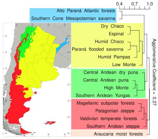 To study the geographic patterns of richness and threat in a biogeographic context, we analyzed the distribution of four variables: a) number of species (richness), b) number of threatened species (considering as threatened species all species under CR, EN, and VU categories), c) number of endemic species (species only present in Argentina), and d) number of threatened endemic species. First, we registered numbers of these variables for political provinces, ecoregions, and biomes of Argentina; these last two eco-geographical classifications sensu Olson et al. (2001) and included in a shapefile provided by the WWF (https://www.worldwildlife.org/publications/terrestrial-ecoregions-of-the-world). Although these values were calculated at family level, they were also estimated for the different tribes (Al-Shehbaz, 2012b). In addition, the similarity of ecoregions in terms of their species composition was studied using Jaccard distances and agglomerative hierarchical clustering with the unweighted pair- group average (UPGMA) algorithm in the R packages vegan v2.5-6 (Oksanen et al., 2019) and cluster v2.1.0 (Maechler et al., 2019).