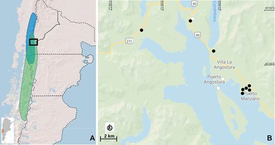 En la Argentina, C. argentina habita en una estrecha franja de bosque a lo largo de las laderas de las provincias de Neuquén, Río Negro y norte de Chubut, cerca de la frontera con Chile, en donde las precipitaciones superan en algunos lugares los 4000 mm anuales. En Chile, se encuentra en el valle central y el piedemonte andino, en bosques muy húmedos, desde la Región de Ñuble hasta la provincia de Llanquihue en la Región de Los Lagos (Fig. 1A). Se encuentra bajo el denso follaje de los bosques de Nothofagus hasta los 1450 m s.m. (Guerreiro & Vega, 2019).