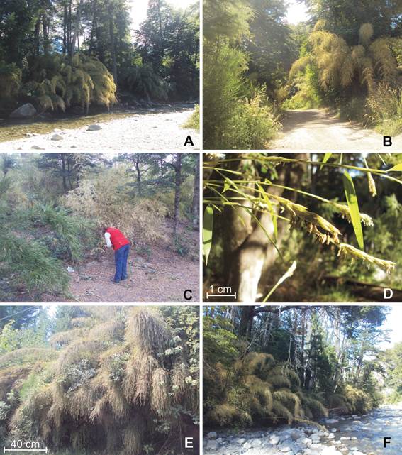 Los ejemplares florecidos se destacaban a simple vista por sus culmos erectos en la base y arqueados en el ápice con numerosas ramificaciones flexibles de 30-35 cm, péndulas (Fig. 2A-B); contrastantes con las ramificaciones erectas y rígidas propias de C. culeou, especie dominante de la zona. Los caracteres morfológicos vegetativos y reproductivos analizados en los ejemplares coleccionados permitieron corroborar la identidad de este material como C. argentina. Hasta el presente, no existían registros fehacientes de C. argentina para la localidad de Villa La Angostura. Al parecer, su presencia pasó inadvertida hasta producirse este evento de floración.