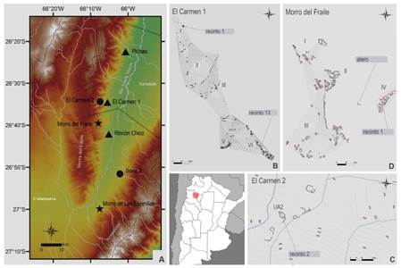 El valle de Santa María, con una altitud de entre 1600 y 2000 m s.m., forma parte del área Valliserrana del noroeste argentino y atraviesa en sentido norte- sur las actuales provincias de Tucumán y Catamarca (Argentina). Surcado por el río Santa María, su colector principal, limita al oeste con la sierra del Cajón y al este con el cordón montañoso sierra del Aconquija- Cumbres Calchaquíes, que lo comunican con el valle del Cajón hacia la puna y con el abra del Infiernillo hacia las yungas, respectivamente (Ruiz Huidobro, 1972). De acuerdo con las investigaciones que dan cuenta de su historia en tiempos prehispánicos, el valle de Santa María ha sido escenario, al menos desde inicios de la era cristiana, de aldeas sedentarias con unidades domésticas dispuestas en terrenos propicios tanto para las actividades agrícolas como pastoriles, que a fines del primer milenio d.C. dieron lugar a los poblados conglomerados característicos del segundo milenio d.C. (Scattolin, 2006). La aparición de concentraciones edilicias en varios puntos elevados del paisaje, alrededor del 1000 d.C., dio lugar al reconocimiento de un patrón definido por la metáfora de chakras y pukaras que llevó a pensar en cambios demográficos y productivos, quizás vinculados a una intensificación agrícola (Tarragó, 2000). Los sitios arqueológicos El Carmen 1 (EC1), El Carmen 2 (EC2) y Morro del Fraile (MF), con evidencias de ocupación residencial, y características de emplazamiento, productivas y cronológicas particulares, dan cuenta de los diversos modos de vida y procesos sociales conocidos para el lapso temporal del primer al segundo milenio d.C. (Fig. 1A). EC1 y MF fueron definidos como centros poblados (Nastri, 1997-1998), con una forma particular de organizar el espacio dada por la monumentalización del espacio residencial (Coll Moritan, 2018a). EC1 representa un típico caso de los pukara (sensu Tarragó, 2011) conocidos para el área Surandina durante el segundo milenio d.C., mientras que MF presenta características particulares que lo asemejan a los poblados de fines del primer milenio d.C. (e.g. Morro de Las Espinillas [Scattolin, 2003]). EC2, por su parte, presenta unidades residenciales cercanas a estructuras agrícolas, así como líneas de piedras que podrían constituir los cimientos de antiguas viviendas como ocurre en las ocupaciones del primer milenio d.C. en el valle (Nastri et al., 2009).