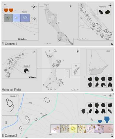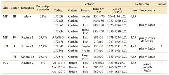 Las muestras analizadas provienen de cuatro contextos habitados en momentos cronológicos particulares que permitirán realizar el análisis diacrónico propuesto: el alero del sector III de MF (MF.A), el recinto 1 del sector IV de MF (MF.R1), los recintos 1 del sector I y 13 del sector IV de EC1 (EC1.R1 y EC1.R13, respectivamente) y el recinto 2 de EC2 (EC2.R2) (Fig. 1B-D, Tabla 1). El análisis arqueobotánico comprende carporrestos (semillas y frutos) y microrrestos procedentes de semillas, frutos y órganos de almacenamiento subterráneos (granos de almidón y fitolitos).