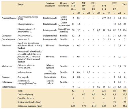 El taxón con mayor densidad de restos recuperados en todos los sitios es Amaranthaceae, con 4,1 carporrestos/litro en EC2.R2, 7,4 carporrestos/litro en MF.A y 34,2 carporrestos/litro en EC1.R13. El segundo taxón con mayor densidad es el género Trichocereus con densidades similares en MF.A y EC2.R2 y, en tercer lugar, Cristaria dissecta en EC2.R2. El resto de los taxones se encuentran en bajas densidades, menores a 0,6 carporrestos/ litro. Si bien la familia Amaranthaceae es el taxón predominante en todos los sitios, se presenta bajo dos patrones diferentes que corresponden a la mayor y menor homogeneidad de los restos encontrados. MF.A y EC2.R2 comparten una asociación similar de diversos granos que podrían corresponder a la variedad domesticada y/o maleza de la especie Chenopodium quinoa, así como a especies silvestres, malezas y/o domesticadas de los géneros Amaranthus y Chenopodium. En EC1. R13 los restos encontrados son muy homogéneos entre sí correspondiendo casi en su totalidad a la especie C. quinoa.