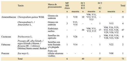 A partir de los 47,6 litros de sedimento analizados se recuperaron un total de 605 carporrestos en estado carbonizado, que en su conjunto representan una densidad de 12,7 carporrestos por litro de sedimento. Se identificó el 90% de los carporrestos recuperados, los cuales corresponden a siete familias: Amaranthaceae, Cactaceae, Cucurbitaceae, Fabaceae, Malvaceae, Poaceae y Solanaceae (Tabla 2). En cuatro de ellas (Amaranthaceae, Cactaceae, Fabaceae y Poaceae) se identificaron 73 restos con diversos rasgos de procesamiento (Tabla 3).