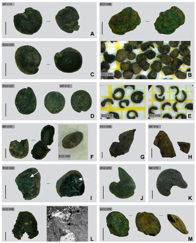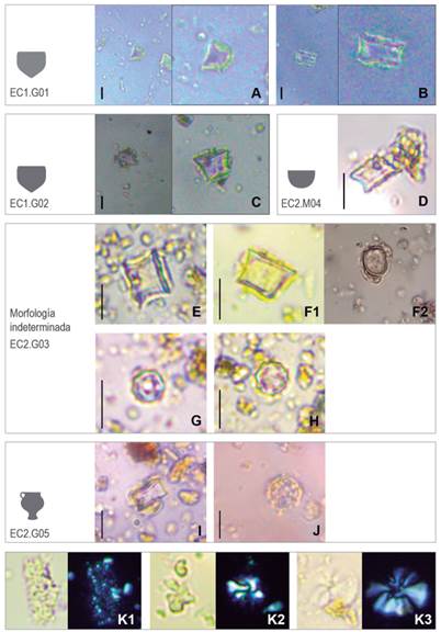 En ninguna de las muestras analizadas se recuperaron almidones. Al observar la primera muestra del raspado de las cerámicas (f1255, EC2.G04) se identificaron estructuras que bajo luz polarizada brillan y presentan líneas que se asemejan a las cruces de los granos de almidón. Sin embargo, sólo son visibles bajo luz polarizada (vs. los granos de almidón visibles con luz normal) y la cruz, si bien gira, presenta brazos sin un patrón definido, los márgenes son difusos y no se tiñen de color negro con lugol. Se pudieron reconocer diferentes estructuras (Fig. 5K) que se pueden confundir con almidones y que se identificaron como muscovita a partir de una muestra de referencia tomada de un fragmento cerámico.
