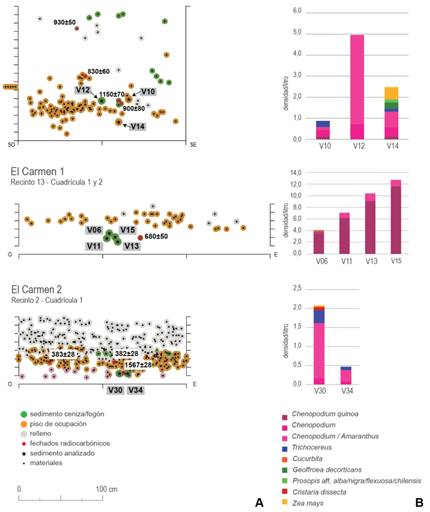 Las semejanzas entre el recinto 2 de El Carmen 2 y el alero de Morro del Fraile indicarían también una diversidad de contextos al interior del segundo milenio d.C., con espacios que muestran una menor diversidad de plantas (recintos 1 y 13 de El Carmen 1) y espacios que, durante el segundo milenio d.C., exhiben prácticas que remiten a aquellas conocidas para las aldeas del primer milenio d.C. (alero de Morro del Fraile), como el consumo de gran diversidad de plantas silvestres, malezas y domesticadas, con predominio de Trichocereus y de diversas Amaranthaceae.