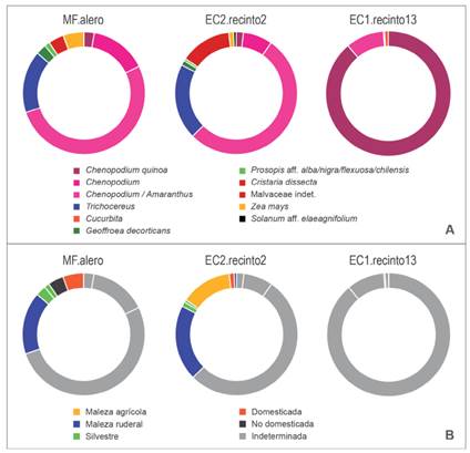 La diversidad de plantas identificadas en MF.A y EC2.R2 se corresponde con distintos grados de asociación humano-planta (Fig. 4B). En estos dos contextos encontramos malezas, como el cardón, plantas silvestres, como el chañar y el algarrobo, así como plantas domesticadas, como el maíz. En estos casos, también, la presencia conjunta de diversos granos de Amaranthaceae podría incluir especies silvestres, malezas y/o domesticadas; mientras que en EC1.R13 las especies de la familia Amaranthaceae corresponderían, principalmente, a la variedad maleza y/o domesticada de Chenopodium quinoa.