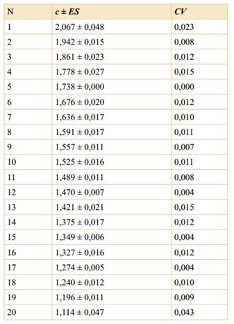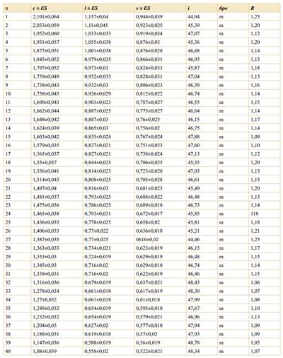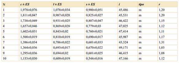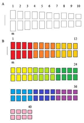 Los parámetros morfométricos de cada cromosoma del citotipo tetraploide se presentan en la Tabla 2. El cariotipo tetraploide está compuesto por 40 cromosomas metacéntricos (40 m, Fig. 2B) y un idiograma poliploide homogéneo (Fig. 3B), con una longitud promedio de los cromosomas de 1,53 µm y una variación entre un valor mínimo de 1,08 µm y uno máximo de 2,1 µm. La LTC tetraploide es de 60,84 µm y el i promedio es de 46,71. La relación entre la longitud del par cromosómico mayor y menor del complemento tetraploide fue de 1,95.