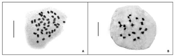 Se realizaron preparaciones de cromosomas mitóticos a partir de ápices radiculares previamente tratados con solución saturada de α-bromonaftaleno por 3 h, fijados en etanol absoluto: ácido acético glacial en proporción 3:1, y conservados en etanol al 70% a 4 ºC hasta su utilización. En el momento de los análisis, en los ápices radiculares se llevó a cabo la tinción convencional de Feulgen y para ello, se hidrolizaron las raicillas en ácido clorhídrico 1N por 10 min a 60 ºC y luego se colorearon con fucsina básica (reactivo de Schiff) en cámara oscura. Los ápices radiculares se maceraron con orceína acética al 2% en un portaobjetos, se les aplicó un cubreobjetos y se analizaron al microscopio óptico Leica DM LS (Leica, Wetzlar, Alemania). Algunos preparados se hicieron permanentes por el método de congelación con nitrógeno líquido y posterior montaje en Euparal o Depex. Durante el análisis de ploidía se tomaron fotomicrografías de metafases selectas usando una cámara Leica MPS 30 (Leica, Wetzlar, Alemania) adosada al microscopio óptico Leica DM LS.