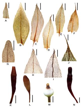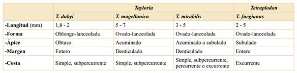 En los gametofitos, los filidios tienen una longitud, forma, tipo de ápice y nervio que permiten identificar a cada especie (Tabla 1 y Fig. 1A-J). Se destaca la reducida longitud (1,8-2 mm) que presentan los filidios de Tayloria dubyi (Fig. 1A, B) en relación a las otras especies estudiadas. T. magellanica y T. mirabilis presentan filidios con margen denticulado (Fig. 1B, C, H, I) y Tayloria dubyi y Tetraplodon fuegianus tienen margen entero (Fig. 1G, J). Tetraplodon fuegianus, es la única especie con costa excurrente y ápice subulado (Fig. 1F, J). Tayloria mirabilis es la especie con mayor variabilidad en el tipo de costa, puede o no llegar al ápice, ser percurrente o excurrente corto (Fig. 1C-E).