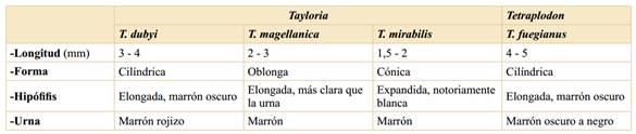 En los esporofitos, la longitud y forma de las cápsulas, morfología y color de la hipófisis y urna, permiten distinguir a las especies (Tabla 2 y Fig. 1K-N). Se destaca la forma cónica y el llamativo color blanco de la hipófisis en Tayloria mirabilis, que las hace fácilmente distinguibles entre las comunidades del sotobosque (Figs. 1M y 3A). Las únicas especies que presentan esporofitos con cápsulas cilíndricas y mayor longitud (3-5 mm), son Tayloria dubyi y Tetraplodon fuegianus, en esta última, las cápsulas son mucho más oscuras, casi negras (Fig. 1K, N).