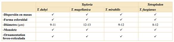 Existe una similitud en cuanto a la forma, tamaño y tipo de ornamentación, entre las esporas de las especies fueguinasylasesporasdeotrasespeciesdeSplachnaceae del hemisferio norte (Aplodon wormskioldii (Hornem.) R. Br. y Splachnum ampullaceum Hedw.) descritas por Boros et al. (1993). Es interesante destacar que esporas de musgos pertenecientes a familias diferentes, pero estrictamente adaptadas a la entomocoria, presentan un mismo patrón escultural. Por ejemplo, Schistostegaceae, con la especie Schistostega pennata (Ignatov & Ignatova, 2001) y las especies estudiadas de Splachnaceae (Aplodon wormskioldii, Splachnum ampullaceum, Tayloria dubyi, T. magellanica, T. mirabilis y Tetraplodon fuegianus) presentan un patrón escultural foveo-reticulado.