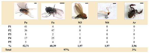 Los pseudoescorpiones (Arachnida) hallados en las trampas, podrían deberse a la atracción de los dípteros atrapados, ya que son arácnidos terrestres de hábitos depredadores que viven en el sotobosque, bajo hojarasca, corteza de troncos, y sobre musgos (Lencinas et al., 2015). Sin embargo, por el momento, no pueden descartarse como posibles vectores de Splachnaceae.