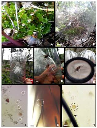 En el campo se pudieron observar y fotografiar los vectores que visitan y posan sobre las cápsulas de los esporofitos de Tayloria mirabilis (Fig. 3A). En el residuo obtenido luego del lavado de los vectores, se observaron esporas de Splachnaceae adheridas en las patas y otras partes del cuerpo (Fig. 3: F-H).