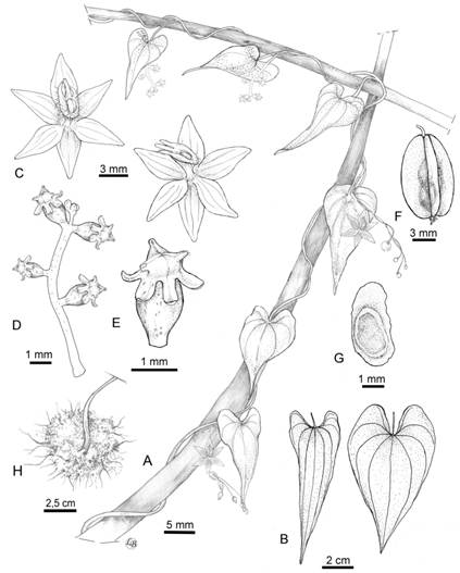 Climbing herb, diclino-monoecious. Twining vine-dextrorse stem, more than 2 m; spherical tubercle, 3-5 cm diam. Sheets ovate-triangular or sagittate, with a narrow basal sinus of 0.5-2.3 cm, acute or acuminate apex, mucronate, cordate or sub-cordate base; petiole 2-4 cm. Racemose staminate inflorescence, 5-10 cm, with (8) 9 or 10 flowers; peduncle 10-15 mm. Solitary flowers; pedicel 2-3 cm; perianth stellate, 5-6 × 1.5-2 mm, purple with greenish-white edges; short staminal column, ca. 1 mm, widened in its apical part into a navicular body, 3.5-4.5 × 1.5-2 mm, finished in three dendriform projections, the central purple and the lateral greenish-white, bearded; single anther inserted in the center of the navicular body; null style rudiment. Pistillate inflorescences in spike, 6-10 cm; flowers purple, 1-1.2 × 0.4-0.5 mm, style with three stigmatic branches, 0.5-0.8 mm; oblong ovary, 1.8-2 × 1-1.2 mm. Trialated capsule, 1-1.1 × 0.5-0.6 cm. Seeds 2-3 × 1-2 mm.
