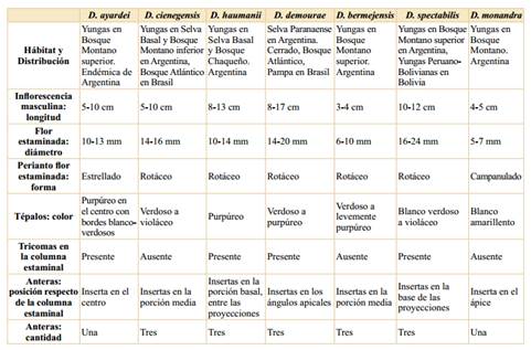 2. Del análisis de los protólogos y de imágenes de alta resolución de los ejemplares tipo de las especies afines, surge que D. ayardei es afín a D. haumanii Xifreda, pero difiere por las características de las flores masculinas: perigonio patente (vs. perigonio reflexo), cuerpo estaminal de forma navicular (vs. cuerpo estaminal ovoide) con tres proyecciones dendriformes casi horizontales (vs. 3, corniculiformes laminares, erectas, curvadas en la parte superior y bordes pilosos) y una antera inserta en el centro de la estructura (vs. 3, alternas con las estructuras carnosas).