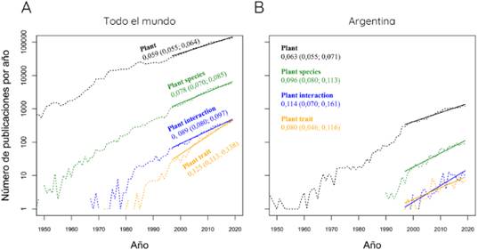 Desde sus inicios a finales del siglo pasado, la ecología basada en rasgos o caracteres (“trait-based ecology”) ha captado la atención de muchos ecólogos en todo el mundo (Funk et al., 2017). Una búsqueda rápida en la bibliografía a nivel mundial muestra que la publicación de trabajos que nombran el término “plant trait” ha crecido mucho más rápido respecto de otros términos relacionados, como “plant interaction” o “plant species” (Fig. 1A). Sin embargo, tal incremento diferencial no parece haber ocurrido en Argentina (Fig. 1B). El principal propósito de este trabajo es entonces fomentar entre lectores locales e hispanoparlantes a los rasgos funcionales como una herramienta útil para el estudio de comunidades ecológicas. En particular, me interesa discutir cómo funcionan estos llamados “rasgos funcionales” (o, simplemente, rasgos fenotípicos). Creo que esta discusión puede ser útil por dos motivos. Primero, entender mejor a las herramientas disponibles nos permite darles un mayor y mejor uso. Segundo, veremos que aún resta mucho por entender respecto de la funcionalidad de los rasgos fenotípicos, lo cual abre vías importantes de investigación.