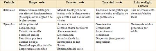 En un trabajo importante para la ecología basada en rasgos, Violle et al. (2007) definen a los “rasgo funcionales” como las características morfológicas, fisiológicas o fenológicas medibles en los individuos que afectan el éxito ecológico o “fitness” individual a través de su efecto sobre la “performance” (en adelante utilizaré el termino en inglés, fitness, por simplicidad). Esta definición está basada en el clásico modelo “morfología-performance-fitness” propuesto por Arnold (1983) para estudiar la selección natural de caracteres en poblaciones. En general, la definición de Violle et al. (2007) coincide con otras definiciones en la conexión causal entre características medibles de los individuos y el fitness (por ejemplo, Ackerly et al., 2000; Geber & Griffen, 2003; McGill et al., 2006). Sin embargo, no parece haber consenso respecto de qué es la “performance”, esto es, las variables que conectan a las puntas de esta cadena causal, lo cual es clave para el avance de este paradigma. Por un lado, están quienes ponen el foco en las tasas vitales, típicamente el crecimiento, la supervivencia y la fecundidad (Ackerly et al., 2000; Geber & Griffen, 2003; Violle et al., 2007), a veces llamadas tasas demográficas o componentes del fitness (Laughlin et al., 2020). Otros enfatizan los procesos de captación y partición de recursos, como la asimilación de CO2 por unidad de masa foliar (McGill et al., 2006).