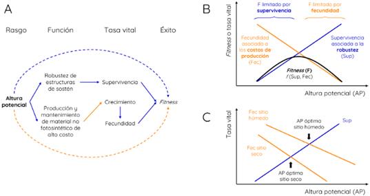 La altura potencial afecta positivamente al fitness a través de su efecto positivo sobre la robustez y la supervivencia (línea azul discontinua en Fig. 2A). No es que la altura esté mecanísticamente involucrada en la robustez, más bien es lo contrario, pero basándonos en esta relación (siguiendo a Westoby et al., 2002) asumimos que la altura potencial es indicativa de la estrategia de las especies en términos de inversión en robustez. En realidad, lo que afecta directamente a la robustez es la calidad de los tejidos, por ejemplo, cuando contienen lignina, que es un compuesto durable pero energéticamente costoso. Esta inversión en sostén limita el crecimiento (línea naranja continua en Fig. 2A): las especies potencialmente más bajas, que invierten menos en sostén durable, pueden crecer más rápido en altura (Falster & Westoby, 2003). Entonces, luego de un disturbio que elimina parcial o totalmente la biomasa vegetal, las especies potencialmente bajas llegan antes a alcanzar la luz en la parte superior del dosel. Pero no llegan muy alto, precisamente porque sus tejidos de sostén no son muy robustos. Tampoco disfrutan de la ventaja lumínica por mucho tiempo, sólo hasta que otras especies que invirtieron más en sostén las sobrepasen. Estas últimas venían creciendo más lento, pero a paso firme; tardaron más en llegar al tope del dosel, pero es probable que estén allí por más tiempo dada su mayor robustez.