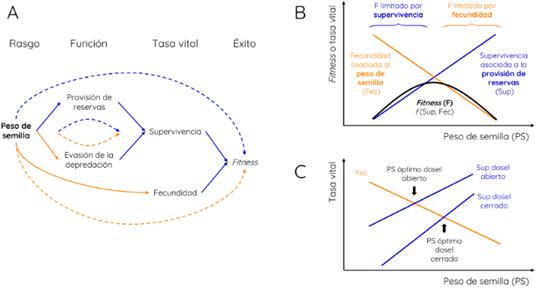 Notemos que el compromiso discutido más arriba no es el único en el que el peso de semilla está involucrado. El peso de semilla también está relacionado negativamente con la evasión de la depredación, la cual a su vez afecta positivamente a la supervivencia (Fig. 3A). Las semillas pequeñas entrarían en el suelo más fácilmente y serían por lo tanto menos propensas a ser depredadas que las semillas grandes (Thompson et al., 1993). Vemos entonces que este compromiso se manifiesta a nivel de la supervivencia, una tasa vital, a diferencia del compromiso anterior, que se observaba a nivel de fitness (Fig. 3A). El compromiso a nivel de fitness, basado en una relación positiva entre peso de semilla y supervivencia, sólo estará operando en caso de que la depredación de semillas no sea muy intensa. Cuando la depredación es intensa, el peso de semilla afectaría negativamente a la supervivencia y la fecundidad, determinando una relación negativa, y no de óptimo, con el fitness (como en los casos discutidos en Pearson et al., 2018).