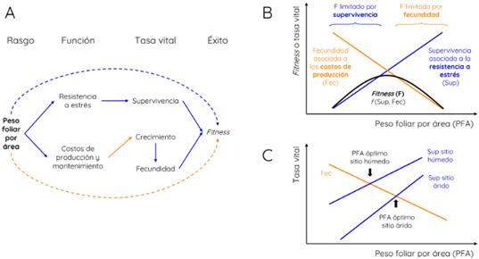 El peso foliar por área (PFA, leaf mass per area en inglés) es el cociente entre el peso seco y el área en estado fresco de una hoja y es la inversa del área foliar específica (Pérez-Harguindeguy et al., 2013). El peso foliar por área es una medida de la inversión energética por unidad de área fotosintética por lo que, a igualdad de otras condiciones, está negativamente relacionado con la tasa de crecimiento de las plantas (Fig. 4A; Poorter et al., 2009). Sin embargo, las hojas con alto peso foliar por área suelen presentar estructuras que las hacen más resistentes a distintas clases de estrés, como el hídrico (Niinemets, 2001; Wright & Westoby, 2002), lo cual está ligado a la supervivencia (Fig. 4A). Por lo tanto, el peso foliar por área reflejaría un compromiso entre velocidad de crecimiento y tolerancia al estrés, discriminando entre especies “rápidas” o “adquisitivas” versus especies “lentas” o “conservativas” (Reich, 2014). Este compromiso se manifiesta a nivel de fitness mediante los efectos opuestos sobre la supervivencia y la fecundad (Fig. 4A) y, como resultado, el fitness muestra una respuesta de óptimo al peso foliar por área (Fig. 4B). Las especies con peso foliar por área menor que el óptimo tienen hojas demasiado blandas lo que limita su supervivencia, mientras que aquellas con peso foliar por área mayor que el óptimo son demasiado conservativas lo que limita su crecimiento y fecundidad.