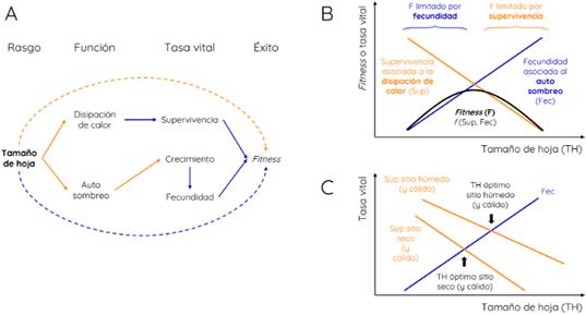 El tamaño de una hoja es generalmente medido como el área de la hoja incluyendo el pecíolo (Pérez-Harguindeguy et al., 2013). A mayor tamaño, mayor es la capa de aire quieto alrededor de ellas (capa límite) y, en consecuencia, menor es la capacidad de las hojas para intercambiar gases con el aire que las rodea y disipar calor a través de la transpiración (Gates, 1968; Leigh et al., 2017). Por esta razón, en sitios donde hay mucha radiación o hace mucho calor (aunque sea por unas horas), el tamaño de hoja afectaría negativamente a la supervivencia (Fig. 5A). Sin embargo, las hojas chicas son menos eficientes que las grandes para interceptar luz, ya que se sombrean más entre ellas (Givnish, 1987). A mayor tamaño de hoja, mayor es la eficiencia de intercepción de luz y, a igualdad de otras condiciones, mayor será el crecimiento (Fig. 5A). Vemos entonces que el tamaño de hoja tendría un efecto positivo sobre el crecimiento y negativo sobre la supervivencia, siempre que nos encontremos en condiciones de temperatura relativamente alta (Fig. 5B).