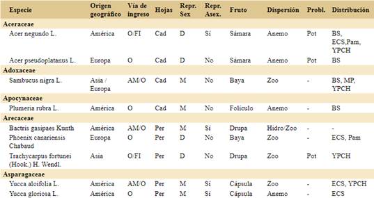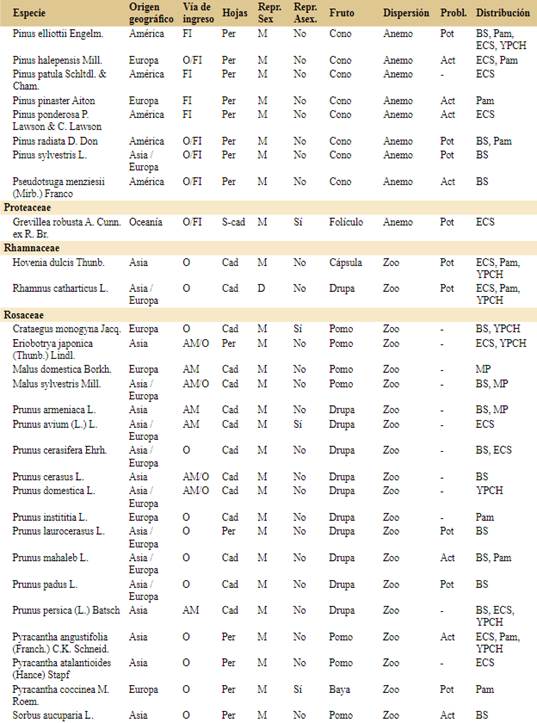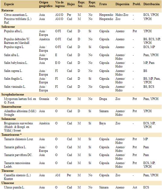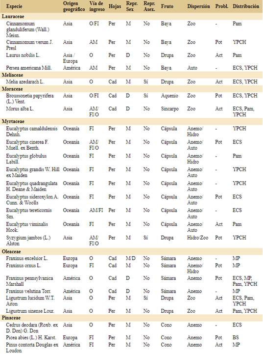Las especies actualmente problemáticas corresponden a 11 familias: Cupressaceae (1), Fabaceae (1), Lauraceae (1), Melicaceae (1), Moraceae (1), Myrtaceae (1), Oleaceae (2), Pinaceae (5), Rosaceae (3) y Ulmaceae (1). Se destaca la familia Pinaceae por contar con el mayor número de especies actualmente problemáticas (Pinus contorta, P. halepensis, P. pinaster, P. ponderosa y Pseudotsuga menziesii). De las especies de amplia distribución en la Argentina, sólo Pinus elliottii está registrada como especie problemática en la Argentina, mientras que Acer negundo, Fraxinus pennsylvanica y Populus alba son potencialmente problemáticas y Salix fragilis no sería problemática. La zona con mayor número de especies actualmente problemáticas así como potencialmente problemáticas en la Argentina es Pam.