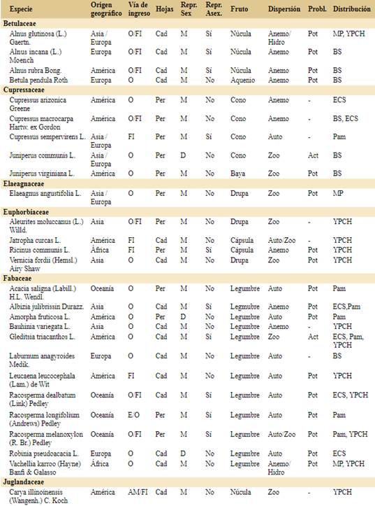 Listado de todas las especies arbóreas introducidas en Argentina. Vía de ingreso: ornamental (O), forestal e industrial (FI), alimenticio y medicinal (AM) y ecológico (E). Fenología del follaje: caducifolia (Cad) y perennifolia (Per). Reproducción sexual: monoica (M) que incluye todas las combinaciones que llevan flores estaminadas y pistiladas en la misma planta o dioica (D). Síndromes de dispersión: anemocoria (Anemo), autocoria (Auto), hidrocoria (Hidro) y zoocoria (Zoo). Problemática: Actualmente problemática en Argentina (Act), Potencialmente problemática en Argentina (Pot) y No problemática (-). Distribución: Bosque subantártico (BS), Espinal-Chaco Seco (ECS), Monte-Patagonia (MP), Pampa (Pam), Yungas-Paranaense-Chaco Húmedo (YPCH). Nota: * Existe al menos una evaluación del costo actual de control de una especie no identificada de Tamarix en Argentina, por lo que alguna de las especies ya es actualmente problemática (Zilio, M. I. 2019. El impacto económico de las invasiones biológicas en Argentina: cuánto cuesta no proteger la biodiversidad. LIV Reunión Anua de la AAEP, Bahía Blanca).