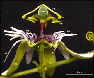 Floral biology analyses included observations of the morphology of the perianth, gynoecium, androecium and corona. Floral longevity was studied by direct observation of the development of previously-marked pre-anthesis flowers (N= 20). Observed characters included the movement of sepals, petals and corona, the movement of filaments and styles, the release of pollen from the anthers, and the receptivity of stigmas before, during and at the end of anthesis.