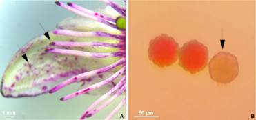 The flowers presented a sweet odor at the beginning of anthesis, around 4 - 5 a.m. Odor remained intense until about 7 - 8 a.m., gradually decreasing until the end of anthesis. Neutral red solution test showed the presence of osmophores, markedly in the sepals and corona filaments and less in the petals, as intensely colored dots mainly on the margins and adaxial surface of the sepals and on the corona tips that coincided among all the evaluated flowers (Fig. 3A).