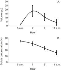 Nectar production rate was evaluated by emptying all nectar from the same set of flowers at two-hour intervals, from 5 a.m. to 11 a.m. (N= 20). The flowers were bagged in pre-anthesis and remained so during the evaluation intervals, as proposed by Kearns & Inouye (1993). Nectar was collected with the aid of 2 and 10 µL microcapillary tubes. The concentration of total solutes in nectar was determined using a portable refractometer with a scale from zero to 50 %.