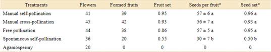 There was no fruit formation in the agamospermy treatment, only in the other treatments (Table 1).The development time, from pollination to maturation of fruits was between 28 and 42 days, regardless of treatment. Fruit abortion was recorded in all treatments, being more pronounced in spontaneous self-pollination, where the fruit set was 0.55, while in the treatments of free pollination and manual pollination, the fruit set was higher than 0.85.