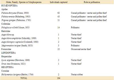 The survey of floral visitors comprised 164 individuals, mainly of the order Hymenoptera, including three bee families (Table 2).