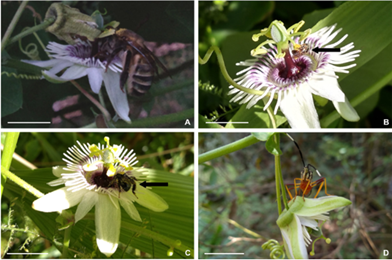 Small bees of the genus Plebeia (Apidae) were the most frequent floral visitors, visiting after 9 - 10 a.m. These bees were mainly seen collecting nectar and/or pollen and walking on the corona, anthers and stigmas (Fig. 5B). Individuals of Trigona spinipes (Apidae) visited after 8 - 9 a.m. and were also seen collecting nectar and/or pollen. According to movement in the flower structures, they occasionally touched the anthers and stigmas with the thorax and head (Fig. 5C). The bees Augochlora sp., A. amphitrite and A. cupreola (Halictidae) were seen collecting nectar, but without touching the anthers and stigmas.
