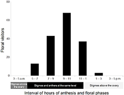 Most floral visitors were observed when flowers were able to donate and receive pollen, with stigmas and anthers positioned at the same level (Fig. 6). They were not observed before the positioning of the anthers and stigmas, at the beginning of anthesis. As the flower closed, and the anthers were directed towards the androgynophore and the stigmas towards the position above the ovary, the number of visits decreased.