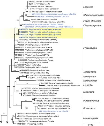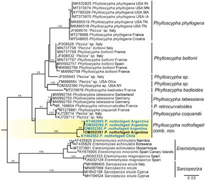 One well-supported species from the newly described genus Phylloscypha (Van Vooren, 2020) was detected from sequences of both Argentine and Chilean collections (Fig. 5). It is recombined here as P. nothofageti.