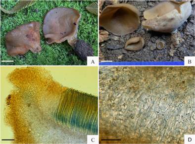 Apothecia up to 3 cm diam., hymenium pale brown, outside smooth or slightly tomentose, concolorous or slightly lighter, with a short but distinct stipe, 4-6 × 10 mm. When young slightly concave, margin becoming in-rolled, at maturity deep cupulate, margin wavy. Flesh fragile, brown in dried material. Asci up to 325 µm, with a terminal operculum, 8-spored, croziers present, contents of young asci intensely dextrinoid in Melzers, ascus walls intensely blue in Melzers along their entire length, with an intensely bluing area at the tip appearing as a blue cap, no bluing ring present. Ascospores uniseriate, narrowly ellipsoid, smooth, hyaline, (17) 19-21 (22) × (7) 8-9 (10) µm, thick-walled when young, thin-walled at maturity, without internal guttules, contents granular, de Bary bubbles sometimes present. Paraphyses only slightly swollen at the tip, to 5-7 µm, unbranched, with yellow inclusions in terminal cells that are released into the mounting medium. Subhymenium densely interwoven textura intricata of cells 5-6 µm diam., with brownish walls, becoming tightly interwoven toward the hymenium. Excipulum composed of three layers, below the subhymenium is a layer composed of globose cells that are less than 100 µm diam. This is subtended by a zone of interwoven hyphae forming a textura intricata. The outer layer composed of globose cells up to 80 µm diam., some cells of which are compressed and radially arranged.