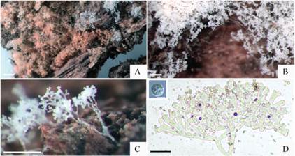 Several anamorphs of this species were collected on wood, woodland debris, and soil in Nothofagaceae forests (Fig. 10). The spore mats are macroscopically visible as clusters of white hyphae with masses of white spores that mature to light salmon-pink. The hyphae that give rise to conidiophores are horizontal with the substrate, septate, hyaline, and sparsely branching. The conidiophores are smooth, hyaline, mononematous, erect, ≤ 1 mm tall × 12.2-15.4 µm diam., septate, and serially apically branching in a dichotomous pattern from the top half or third of the main conidiophore. Conidiophore branches hyaline, septate, 8.5-9.4 µm diam. Mitospores are simultaneously holoblastic from short denticles along conidiophore branches, unicellular, mostly globose but some subglobose, finely ornamented with short warts, pink in mass when mature. Mitospores (N=30) are 5.2 ± 0.28, excluding warts, which are ≤ 0.3 µm tall. Mitospore ornaments are not appreciably darker than the sporoplasm and wall in cotton blue, warts isolated or connected by low ridge with one or two adjacent warts. The conidiophores loosely fit the description and resemble the drawings of the anamorph of Peziza ostracoderma (Hennebert, 1973) and Chromelosporium ochraceum Corda (Hennebert, 2020). Despite the similar anamorph structures, Peziza ostracoderma is not closely related to Phylloscypha. A major difference in the anamorphs is the warts on the mitospores of P. nothofageti, that are connected by a low ridge in places, which is not described for P. ostracoderma mitospores.