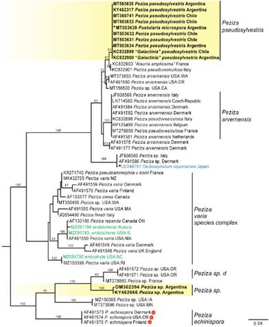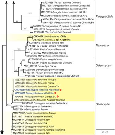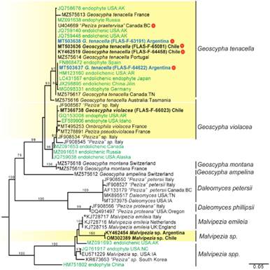An unknown species of Malvipezia, one of the new genera erected by Van Vooren (2020), was detected from two sequences (KY462454 and OM302389) from collections in Argentina and Chile that are molecularly distinct from any other species based on DNA (Fig. 4). Endophytes are also detected within the genus Malvipezia. The Geoscypha-Malvipezia alignment showed a unique indel in the ITS1 of Malvipezia that was approximately 185 bp long in the taxon from South America, 131 bp long in M. emileia, and 134 bp long in endophytes and other undetermined Malvipezia species. Where the indel aligned, there was an 18% difference between the South American species and P. emileia, a 13% difference between the South American species and the endophytes, and a 7% difference between the endophytes and P. emileia.