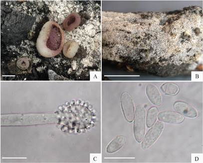 In our collections the excipulum is up to 200 μm thick toward the base. The excipulum rehydrates poorly but seems to be composed of two layers. The spores are clearly ornamented with very minute warts. Field collections of the Oedocephalum conidial state are also listed below. Webster et al. (1964) described this anamorph from spore culture of a specimen named Peziza praetervisa. We report and illustrate this anamorphic state from field collected materials which were encountered in fire pits. This species is frequently isolated as an endophytic or endolichenic fungus from around the world (Healy et al., 2022). We have included sequences of some of these isolates in Fig. 4.
