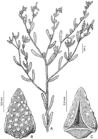 Hierbas generalmente acojinadas, seríceas, en ocasiones ligeramente híspidas; tallos ascendentes o erectos, en ocasiones decumbentes, seríceos, en ocasiones ligeramente híspidos. Hojas con lámina linear, en ocasiones estrechamente elíptica u oblanceolada, de 1-5 × 0,1-0,4 cm, ápice agudo, en ocasiones obtuso, serícea en ambas superficies, con tricomas de base pustulosa en la superficie adaxial. Inflorescencias en cincinos de 1-8 cm de largo. Flores sésiles; cáliz híspido con tricomas adpresos, de 1-2,5 mm de largo; corola tubular, en ocasiones hipocraterimorfa, con tubo de 1,5-3 mm de largo, limbo de 1,5-2 mm de diámetro. Fruto con clusas ampliamente ovado-deltadas, de 1-1,5 mm de largo, inclusas en el cáliz fructífero de 2,5-3 mm de largo, a veces con base truncada, cara dorsal tuberculada y finamente granulada, margen redondeado, cara ventral con el surco cerrado en el tercio superior, abriéndose luego para formar una profunda cavidad triangular, ginobase anchamente piramidal, grisáceas o parduscas.